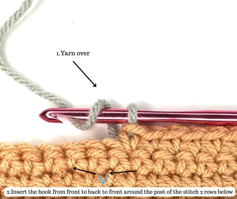 When you see “work around the post of the stitch located two rows below,” it means that instead of inserting your hook into the working row, you reach down two rows.