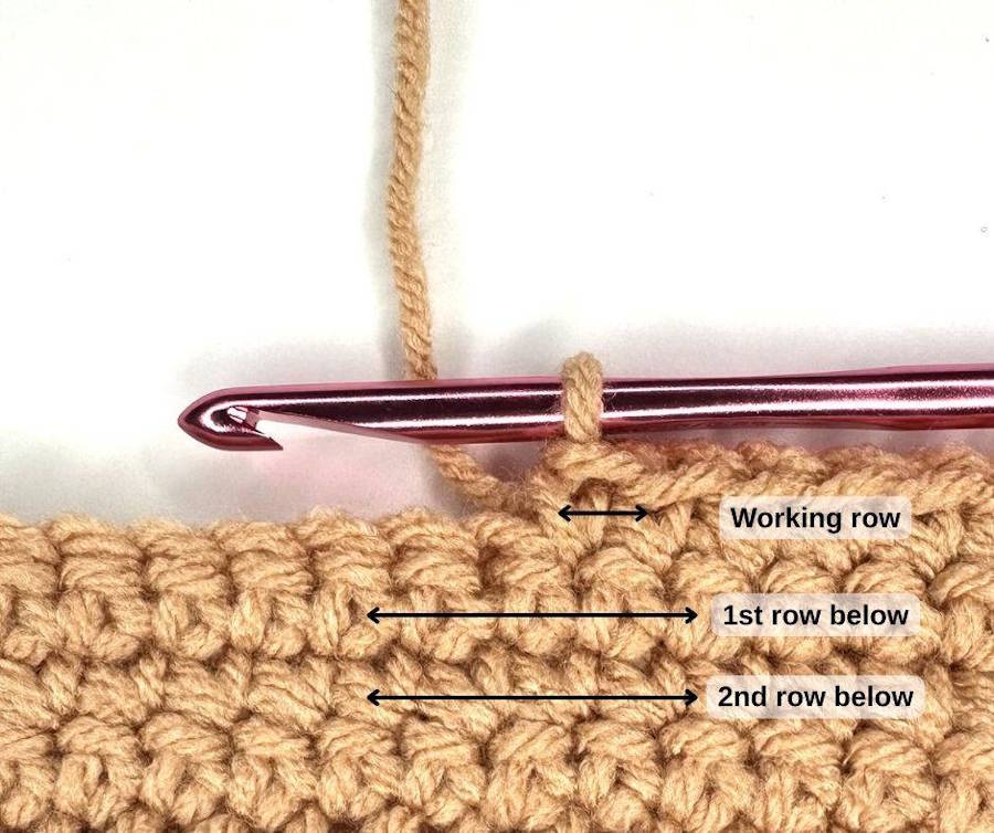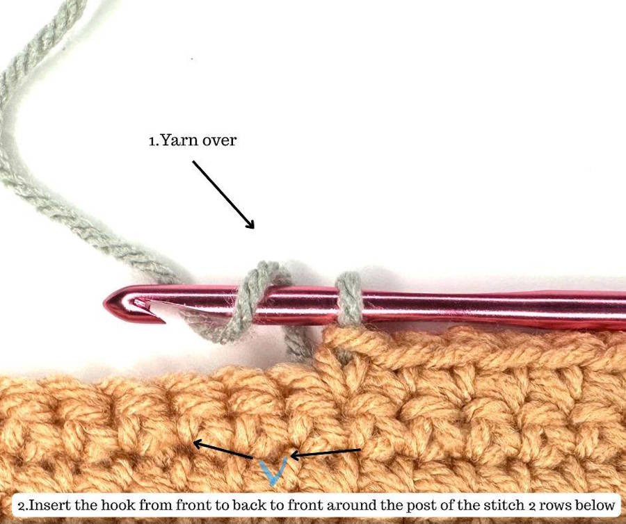 When you see “work around the post of the stitch located two rows below,” it means that instead of inserting your hook into the working row, you reach down two rows.
