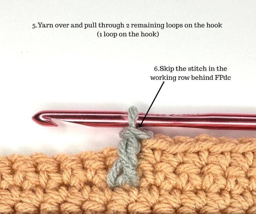 FPdc – front post double crochet: yo, insert your hook from front to back to front around the post of the stitch 2 row below and pull up a loop; yo and draw through 2 loops, yo and draw through the remaining 2 loops on the hook. Always skip the stitch behind each FPdc.