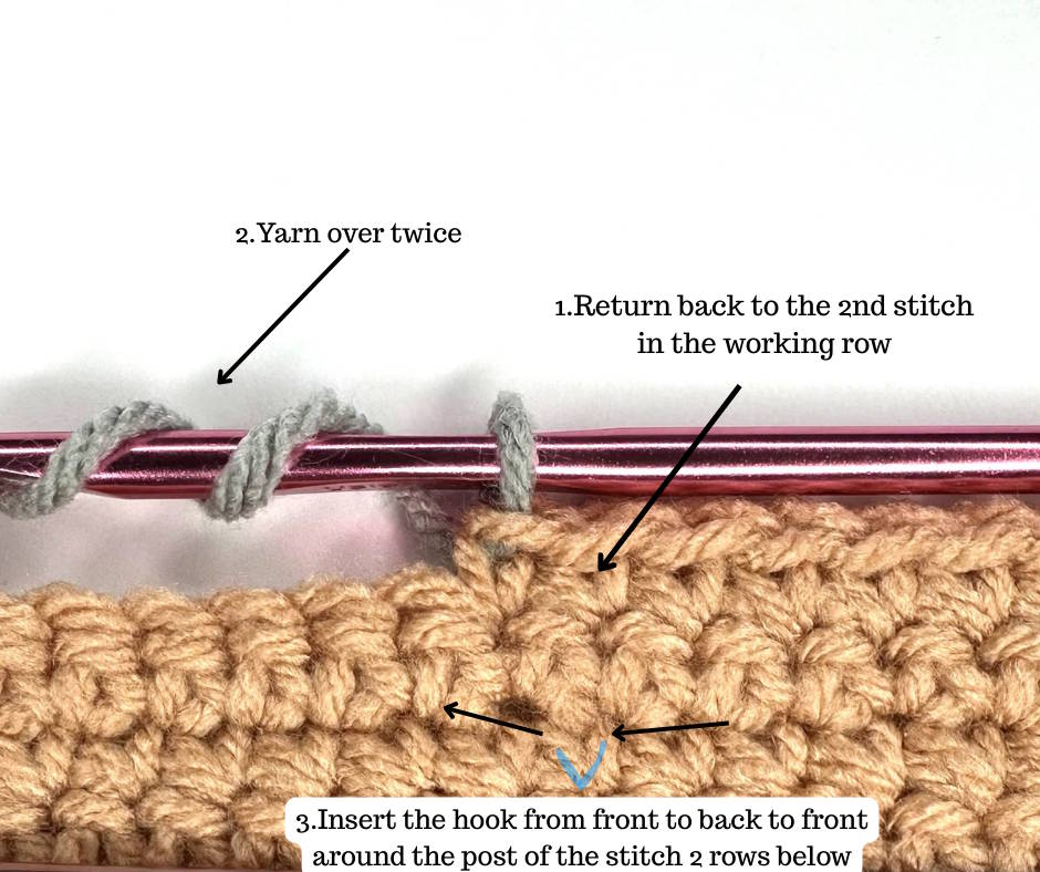 When you see “work around the post of the stitch located two rows below,” it means that instead of inserting your hook into the working row, you reach down two rows.