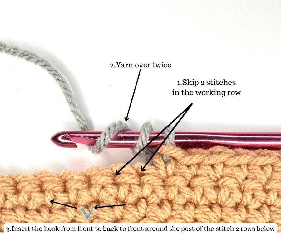 When you see “work around the post of the stitch located two rows below,” it means that instead of inserting your hook into the working row, you reach down two rows.