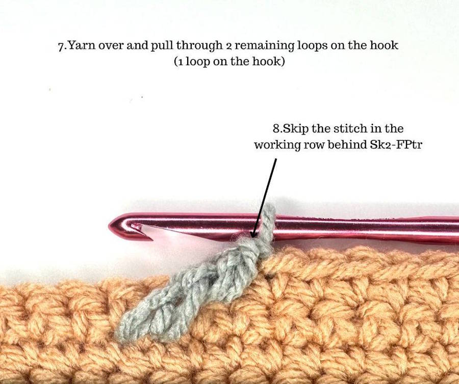 So, Sk2-FPtr means: Skip 2 stitches and work a Front Post treble crochet around the post of that stitch (usually two rows below).