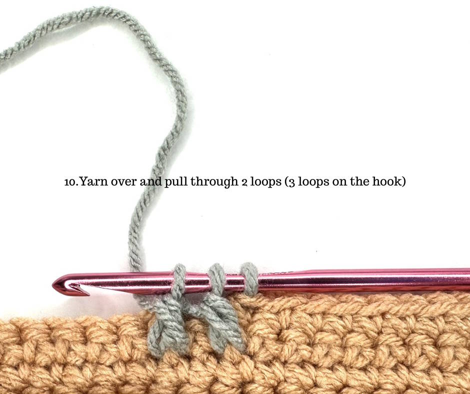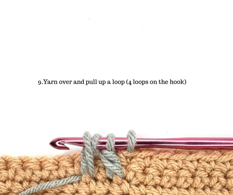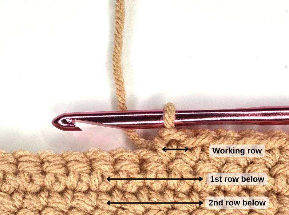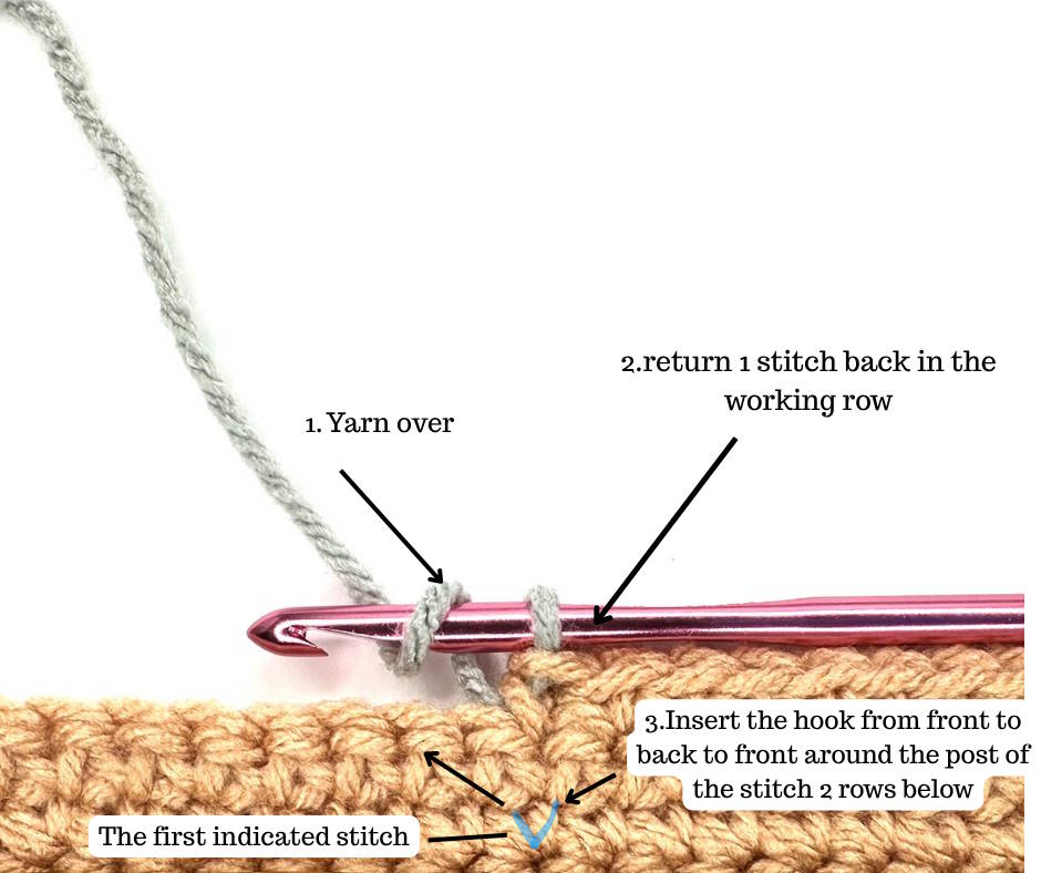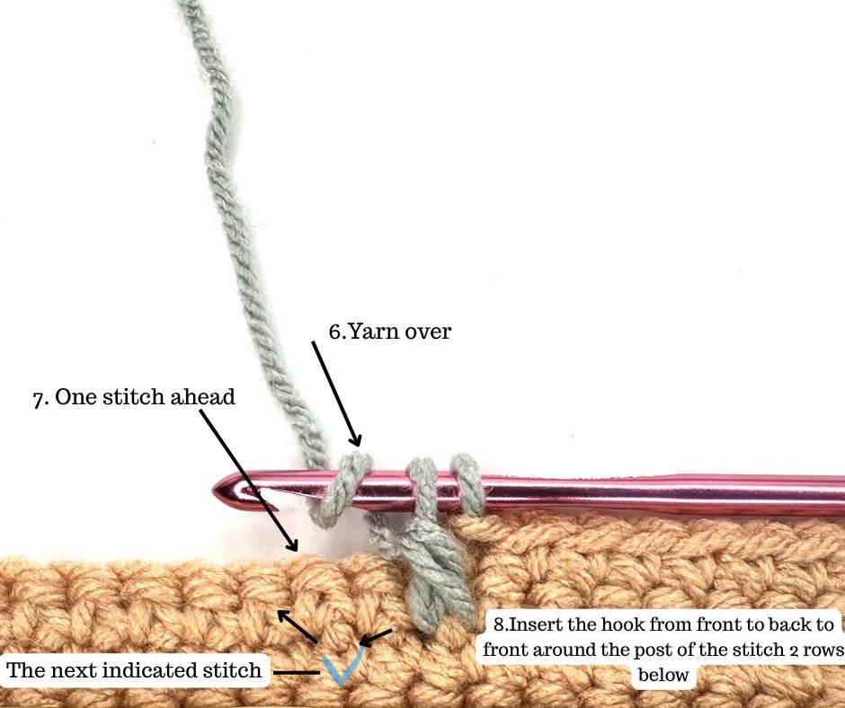 When you see “work around the post of the stitch located two rows below,” it means that instead of inserting your hook into the working row, you reach down two rows.
