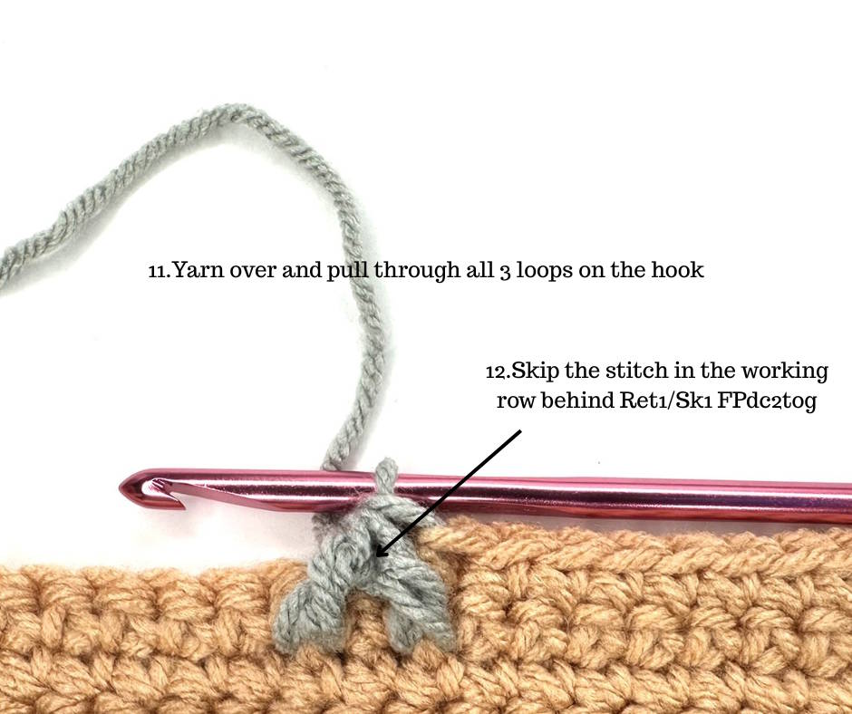 Ret1/Sk1 FPdc2tog is essentially a standard front post double crochet two together, but worked into specific locations. The first leg is worked around the post of a stitch one stitch back and two rows below, and the second leg is worked around the post of a stitch one stitch ahead and two rows below.