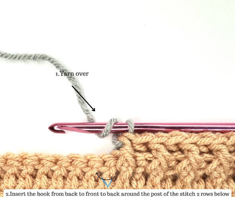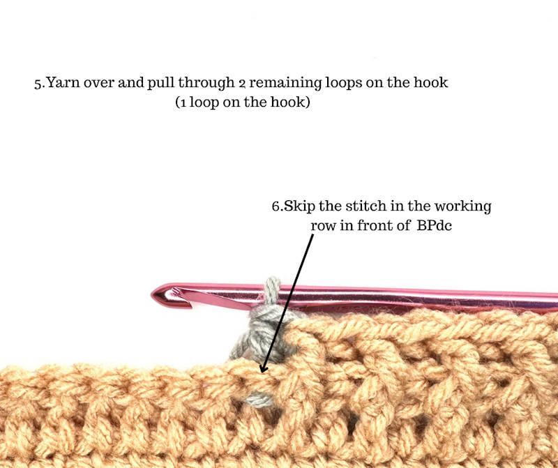 BPdc – back post double crochet: yo, insert your hook from back to front to back around the post of the stitch below and pull up a loop; yo and draw through 2 loops, yo and draw through the remaining 2 loops on the hook. Always skip the stitch in front of each BPdc.