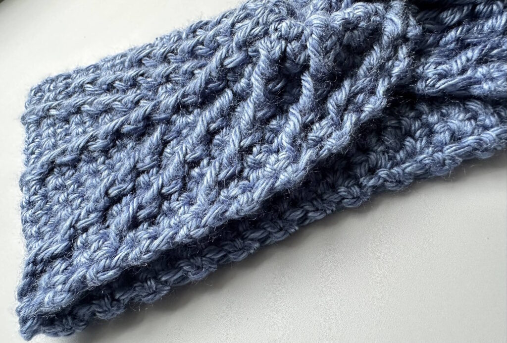 The Arrow Ridge Headband Crochet Pattern is worked flat in rows, using single crochet (sc) and front post double crochet (FPdc) stitches to create a rich, textured design with a modern arrow-inspired look. The alternating front post stitches form subtle ridges that give this crochet ear warmer its signature 3D texture, combining warmth, stretch, and style.