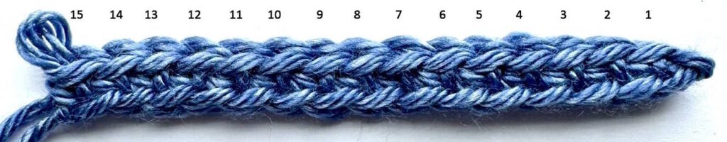 sc in 2nd ch from hook and in each ch across; ch 1, turn – 15 sts.