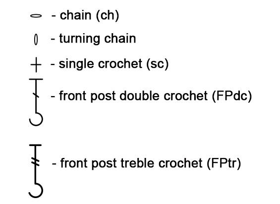 (…) – indicate the stitch around which the front post (or back post) stitch is worked