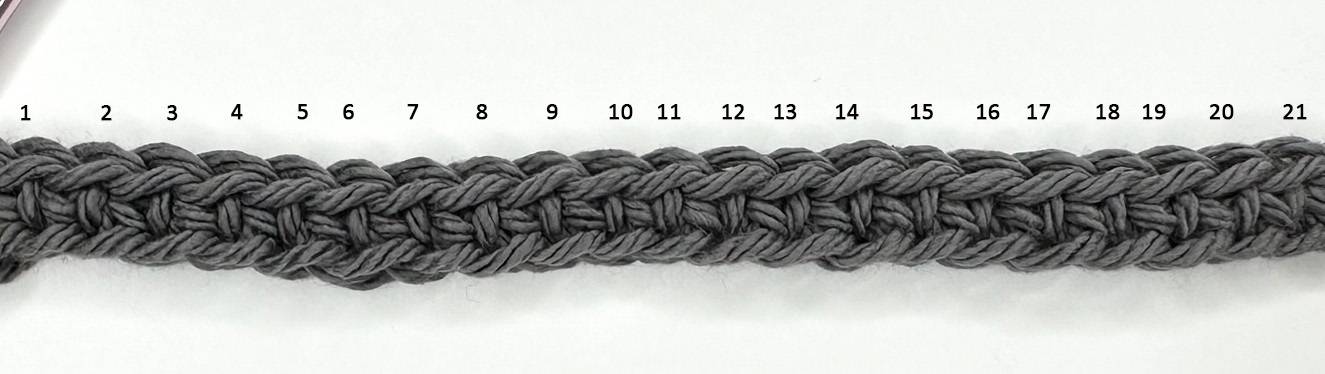 The pattern worked in joined rounds with turns at the end of each round. Beginning ch does not count as a stitch.