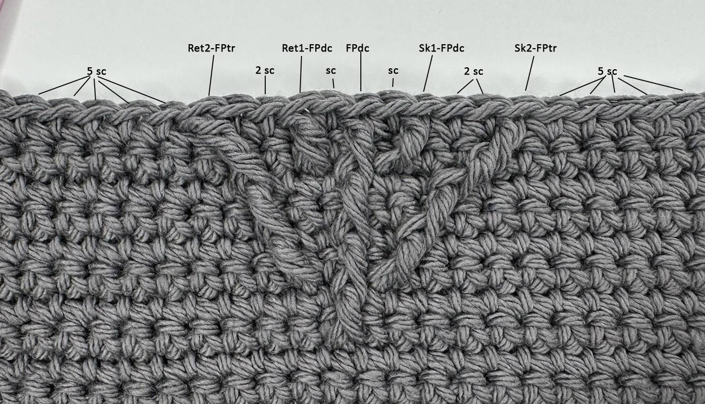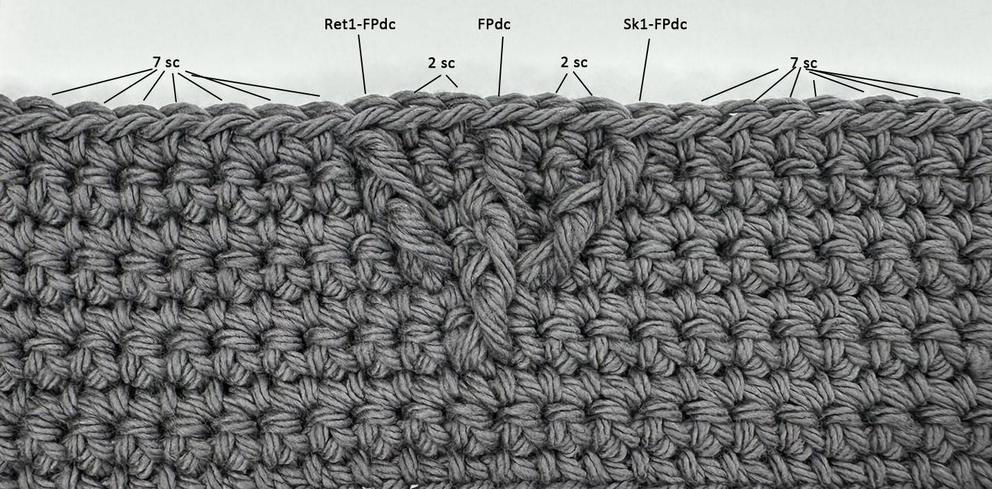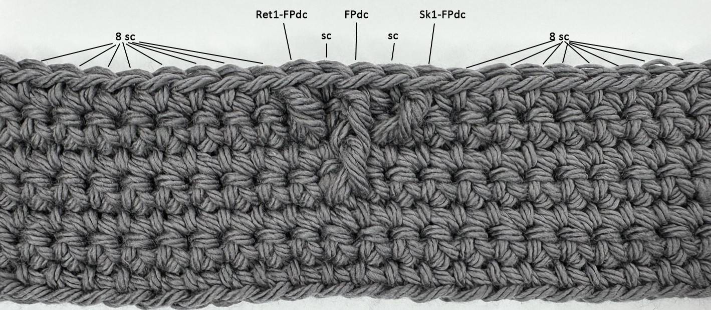 Round 7: [Sc in first 8 sts, Sk1-FPdc (around sc), sc, FPdc (around FPdc), sc, Ret1-FPdc (around sc), sc in next 8 sts] twice; ch 1, turn – 42 sts.