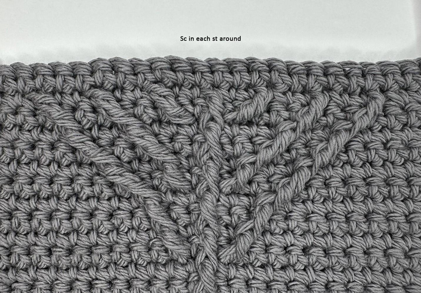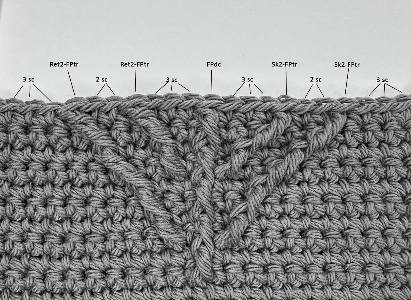 Front post stitches are always worked around the post of the stitch two rows below, whether that stitch is a regular sc or another front post stitch. To avoid distortion or curling of the fabric, make sure to work all front post stitches loosely and evenly. Excess tension on front post stitches can cause the pattern to lean or tighten.