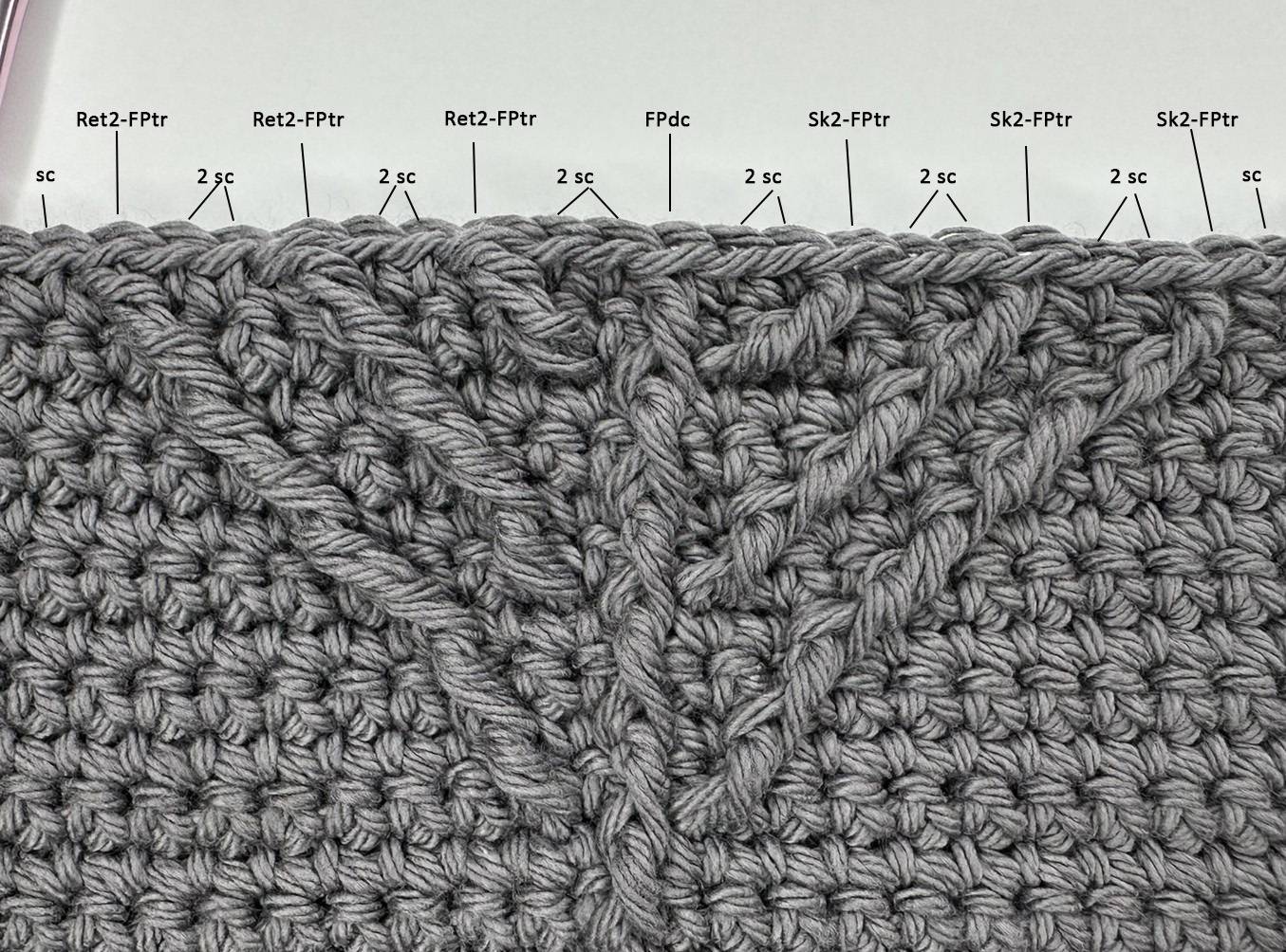 Sk2-FPtr (skip 2 stitches front post treble): skip the next 2 stitches in the working row; yo twice, insert your hook from front to back to front around the post of the stitch 2 rows below and pull up a loop; [yo and draw through 2 loops] twice, yo and draw through the remaining 2 loops on the hook in front of the 2 skipped stitches. Always skip the stitch behind every Sk2-FPtr. Full tutorial here