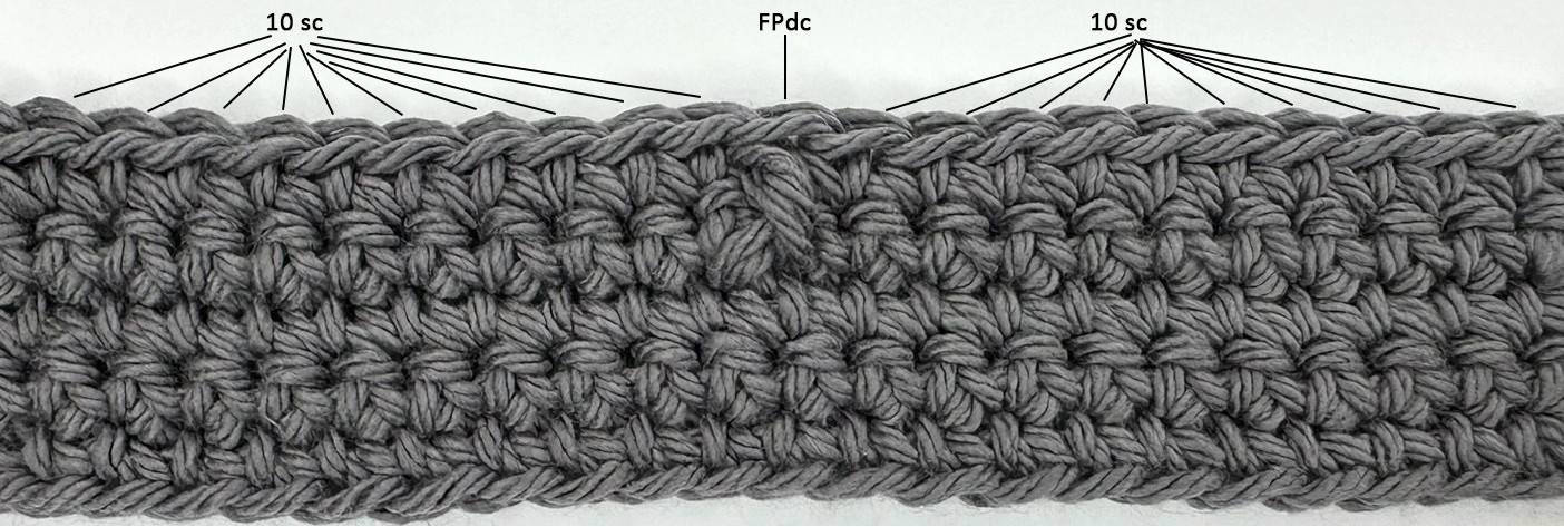 Round 5 (RS): [Sc in first 10 sts, FPdc, sc in next 10 sts] twice; join with a sl st to the first sc; ch 1, turn – 42 sts.